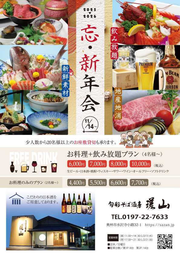 忘年会、新年会、歓送迎会、同窓会、結婚式の二次会、ご法事、ご家族の記念日、ご接待など